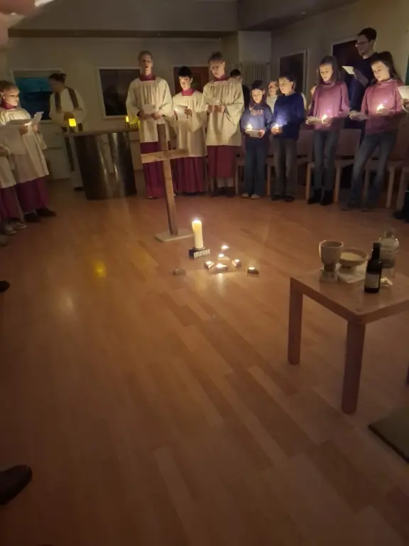 Und immer donnerstags feiern wir eine kleine Andacht um 7 Uhr morgens in der Kapelle. Am 4.12. feierten wir sogar eine Rorate-Messe mit Pfarrer Dr. Marius Fletschinger. Eine Rorate-Messe ist eine besondere Messe im Advent bei Kerzenschein. Der Leistungskurs Religion unserer K1 hatte Impulsfragen zum Evangelium und die Fürbitten vorbereitet, 7 Freiwillige waren zum Ministrantendienst erschienen, Herr Dolmetsch begleitete uns stimmungsvoll an der Gitarre und eine Gruppe von rund 50 Schülerinnen und Schülern, Lehrern und Lehrerinnen feierte diese Messe. Beim anschließenden Frühstück in der Schulküche war es zwar ein wenig eng, aber jeder konnte irgendwo sitzen und satt wurden alle.
