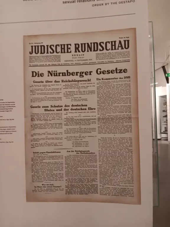 Am Donnerstagnachmittag fand noch eine Führung durch das Jüdische Museum statt. Wir trafen uns vor dem Museum. Schon als wir ankamen, fiel uns die beeindruckende Polizeipräsenz auf. Überall standen Polizisten und wir wurden beim Hineingehen wie an einem Flughafen kontrolliert. Nachdem wir unsere Sachen abgegeben hatten, wurden wir mit Audiogeräten verkabelt. Unser Guide führte uns unterirdisch in das Museum hinein. Im Museum erklärte sie uns zunächst die architektonischen Bedeutungen der drei Achsen des Museums und führt uns dann zur Abteilung zur Geschichte des Judentums im Dritten Reich. Hier erfuhren wir einiges zu Übergriffen und Gesetzen gegen Juden, insbesondere den Nürnberger Gesetzen. Uns blieben vor allem die Beispiele der Schicksale der Juden im Dritten Reich in Erinnerung. Alle waren am Ende sehr bewegt.