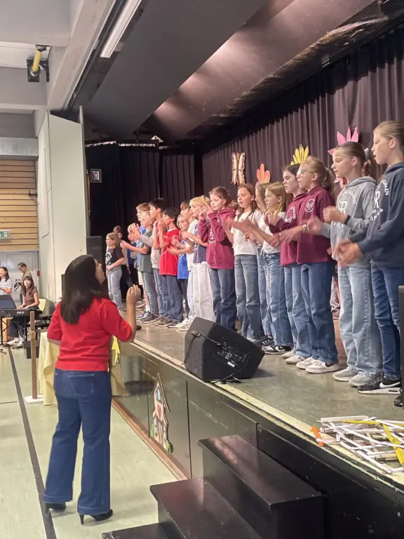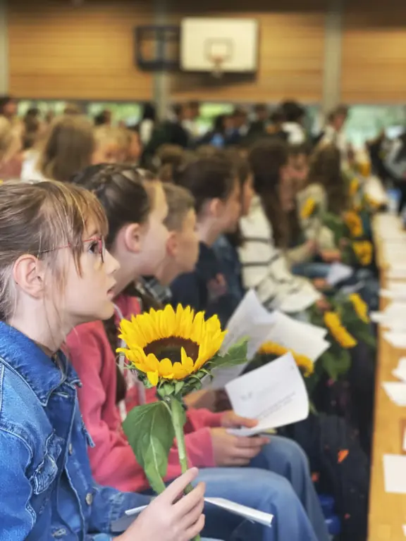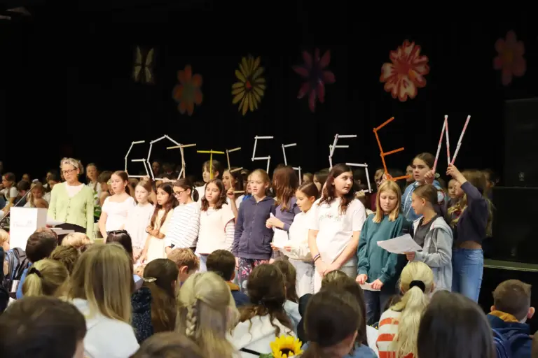 Die Einschulung begann mit lachenden und nervösen Kinderaugen in einem Gottesdienst. Der Chor der 6. Klassen unter der Leitung von Melanie Wolber, begleitet an Percussion, Klavier und Querflöte von ihr, Leonie Zhang (10c) und Dora Hwang (9b) sorgte für eine Wohlfühlatmosphäre im Wohlfühlort St. Raphael, den Katharina Siehl-Kaegi und die Schülerinnen und Schüler der 6. Klassen in den Fürbitten betonten. Passend dazu zeigte sich Katherina Pistorius‘ Bühnenbild.