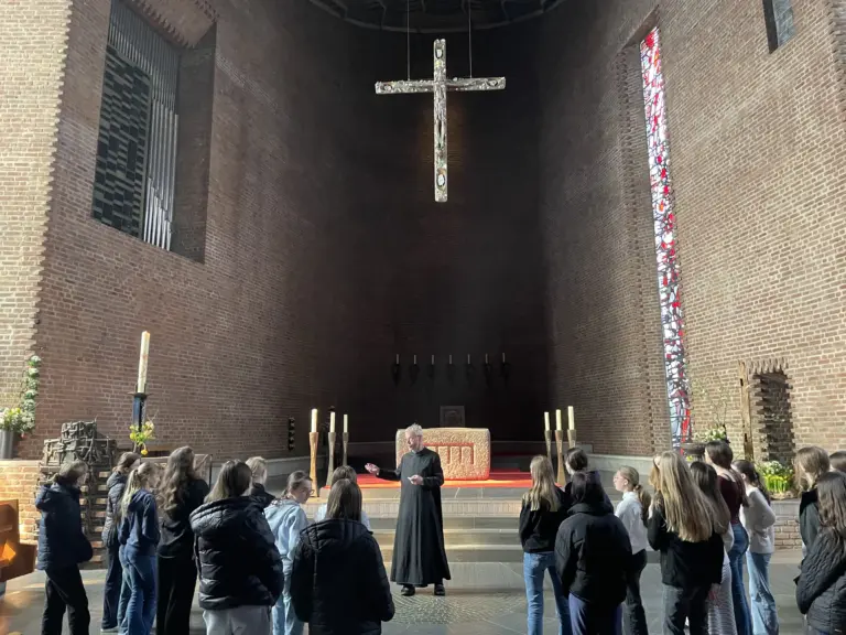 Grüße aus Meschede von der Klasse 8aR, die derzeit Klostertage erlebt und dabei viele eindrückliche Momente sammelt. Das Bild zeigt die Schülerinnen am Altar der Klosterkirche – ein Ort der Ruhe, der Besinnung und des gemeinsamen Innehaltens.